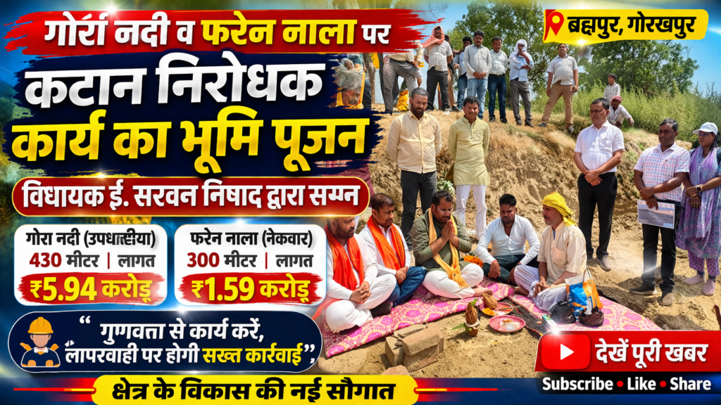 ब्रह्मपुर (गोरखपुर): चौरीचौरा विधानसभा क्षेत्र के ब्रह्मपुर ब्लॉक में गोर्रा नदी एवं फरेन नाला पर कटान निरोधक कार्यों का भूमि पूजन विधायक इंजीनियर सरवन निषाद द्वारा किया गया। इस दौरान उन्होंने बाढ़ खंड के अधिकारियों एवं ठेकेदारों को निर्माण कार्य में गुणवत्ता बनाए रखने के निर्देश दिए और किसी भी प्रकार की लापरवाही पर सख्त कार्रवाई की चेतावनी दी।
