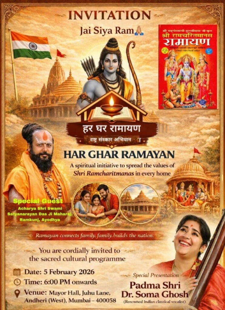 🕉️ हर घर रामायण अभियान (राष्ट्रीय कार्यक्रम) का भव्य शुभारंभ मुंबई मेंसंत, कलाकार, राजनेता, मीडिया व फिल्म जगत की ऐतिहासिक सहभागितामुंबई, प्रतिनिधि।भारतीय संस्कृति, संस्कार और श्रीराम के आदर्शों के पुनर्जागरण के उद्देश्य से आयोजित “हर घर रामायण अभियान” (राष्ट्रीय कार्यक्रम) का भव्य शुभारंभ 5 फरवरी 2026 को मेयर हॉल, जुहू लेन, अंधेरी (पश्चिम), मुंबई में अत्यंत श्रद्धा, भक्ति और गरिमा के साथ संपन्न हुआ।